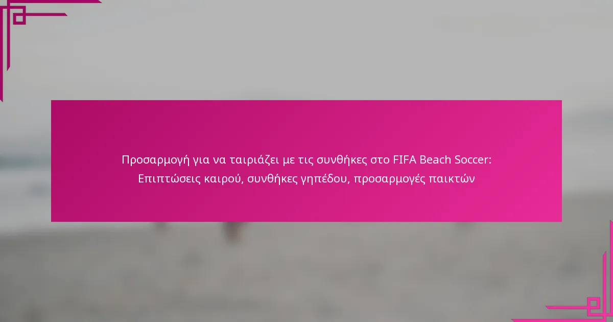 Στο FIFA Beach Soccer, οι καιρικές συνθήκες και τα χαρακτηριστικά του γηπέδου παίζουν καθοριστικό ρόλο στη διαμόρφωση της δυναμικής του παιχνιδιού. Παράγοντες όπως η ζέστη, ο άνεμος και οι διάφορες υφές της άμμου μπορούν να επηρεάσουν σημαντικά την απόδοση και τη στρατηγική των παικτών, απαιτώντας γρήγορες προσαρμογές από τις ομάδες. Με την κατανόηση και την προσαρμογή σε αυτά τα περιβαλλοντικά στοιχεία, οι παίκτες μπορούν να βελτιώσουν το παιχνίδι τους και να ελαχιστοποιήσουν τους κινδύνους τραυματισμών.